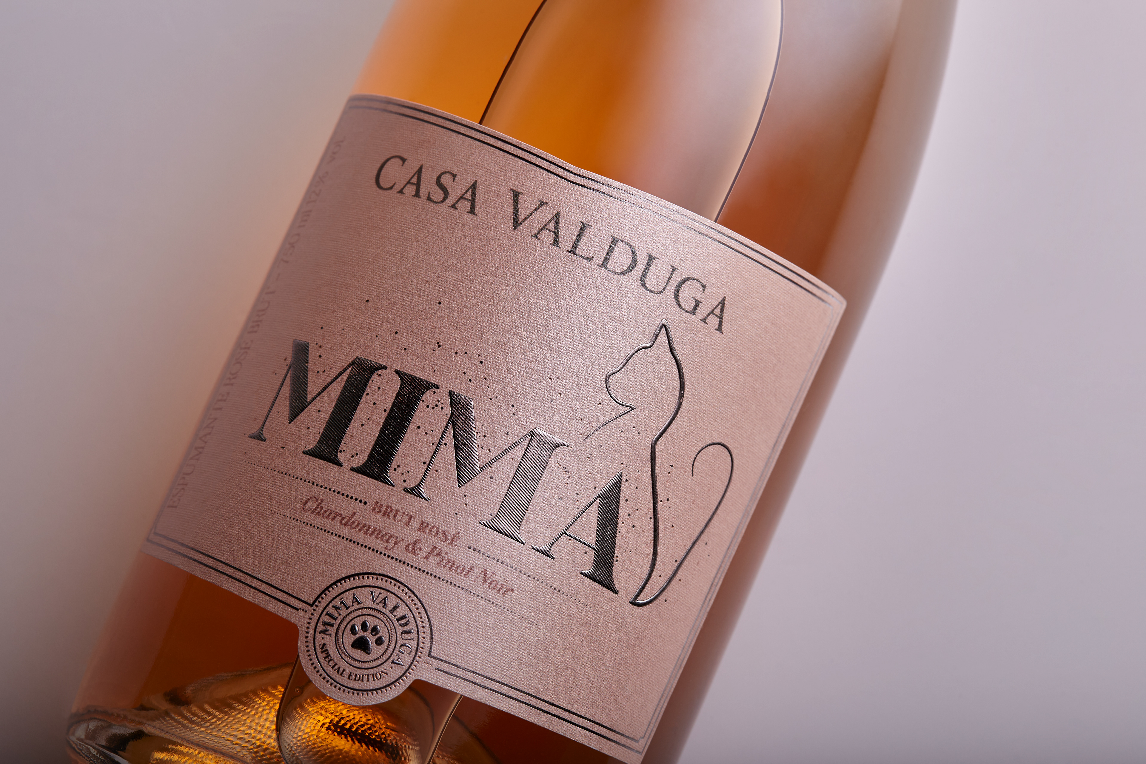 O rótulo dos espumantes Mima foi desenvolvido com uma faca exclusiva, inspirada no rosto da felina e composto por papel premium e alto nível de acabamentos gráficos que conferem elegância e delicadeza ao produto. Além disso, foi desenvolvido um pingente com cordão como acessório, que pode ser utilizado como pingente de joias e coleiras de pets, ou usado como berloque em pulseiras pelos amantes de gatos.