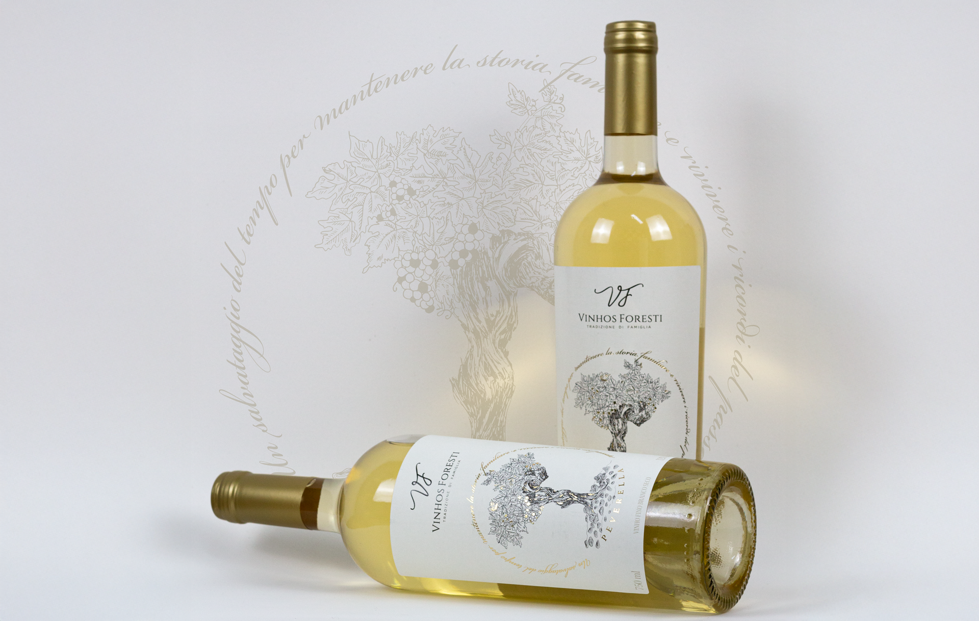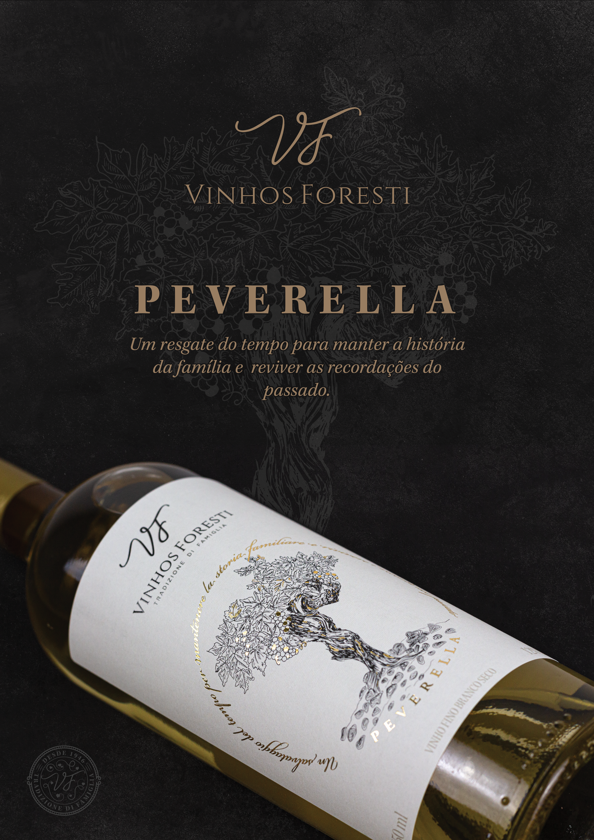 Peverella é uma uva rara trazida pelos imigrantes italianos e cultivada por gerações na família Foresti. Com uma ilustração feita a mão, papel e acabamentos especiais, este rótulo expressa a singularidade desse vinho tão especial. Projeto de rótulo + Fotografia de produto + Banner